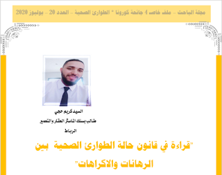 قراءة في قانون حالة الطوارئ الصحية بين الرهانات والاكراهات-الباحث كريم حجي - العدد 20 من مجلة الباحث القانونية - موقع الباحث