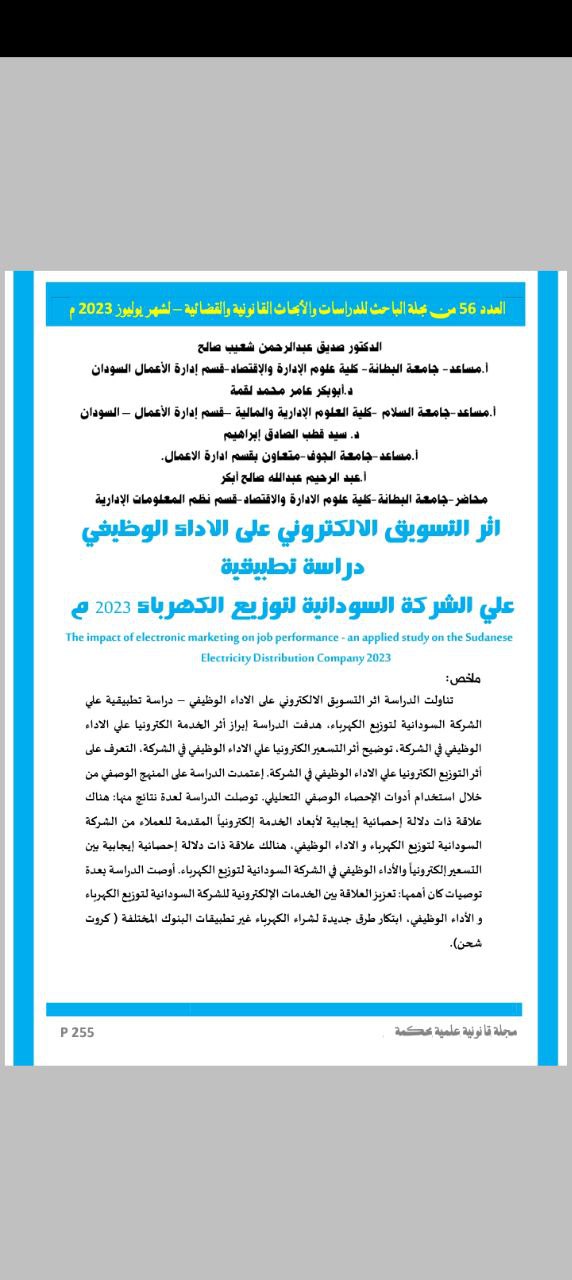 اثر التسويق الالكتروني على الاداء الوظيفي - الدكتور صديق عبدالرحمن شعيب صالح ومن معه- العدد 56 من مجلة الباحث - منشورات موقع الباحث - تقديم د محمد القاسمي