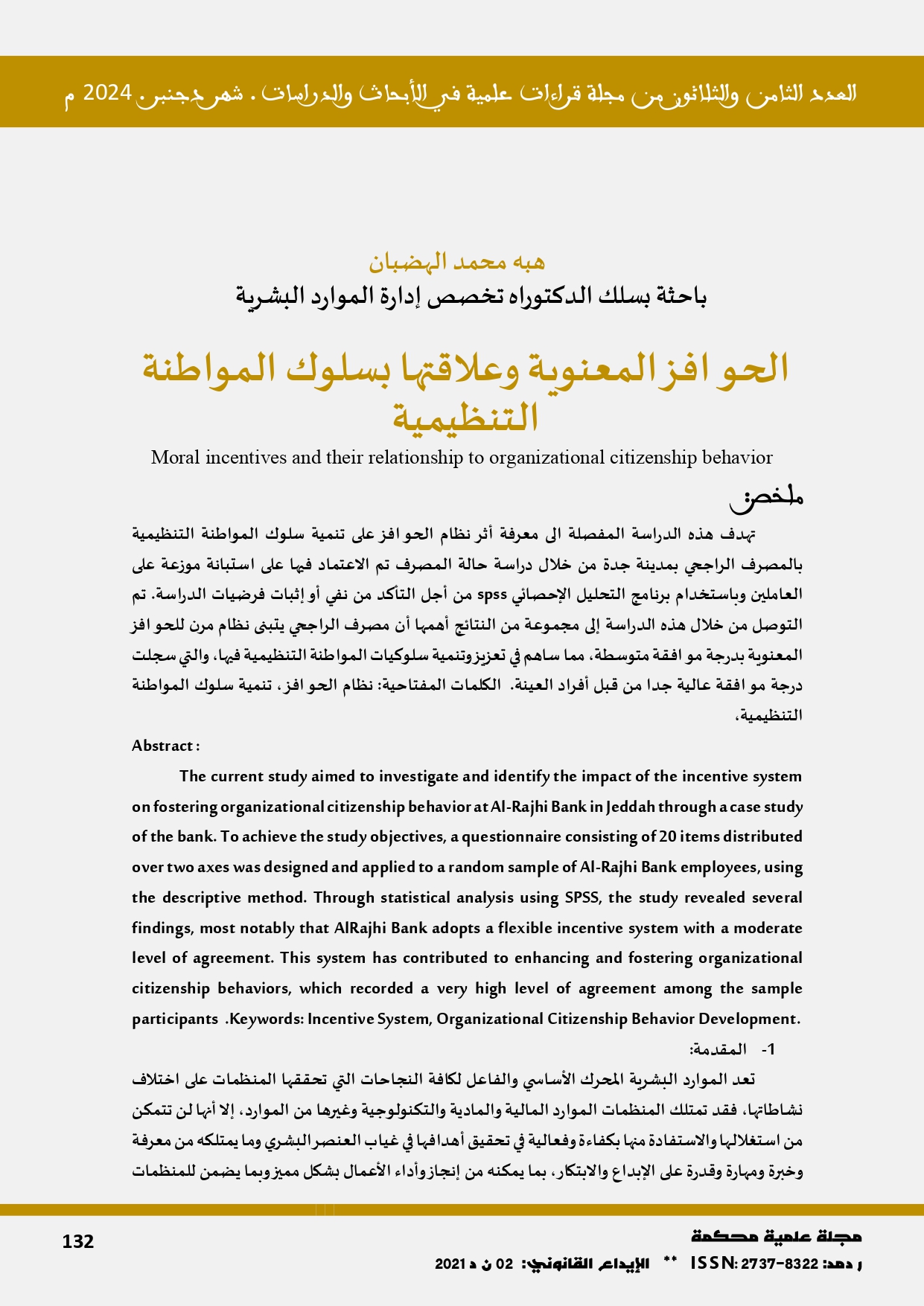 الحوافز المعنوية وعلاقتها بسلوك المواطنة التنظيمية هبه محمد الهضبان - العدد 38 من مجلة قراءات علمية - تقديم ذة حليمة عبد الرمى - منشورات موقع الباحث العلمي